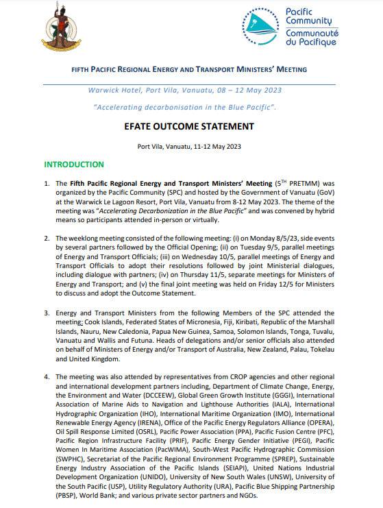 Fifth Pacific Regional Energy and Transport Ministers Meeting: EFATE Outcome Statement